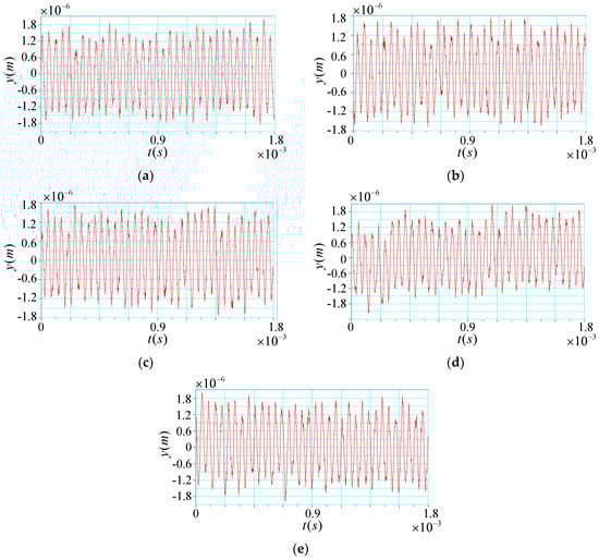 Vibration waveform test results of five test points. (a) Waveform results of test point ①; (b) Waveform results of test point ②; (c) Waveform results of test point ③; (d) Waveform results of test point ④; (e) Waveform results of test point ⑤.