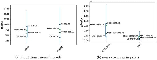 Size and sparsity statistics of the input images. (a) depicts width and height distribution of the parking lot satellite images; (b) contrasts total area of the images (left) vs. parking block polygons area (right).