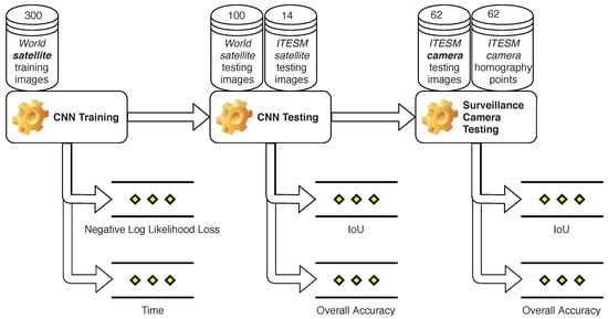 Figure 5 shows a tree structure to help us visualize the data flow and metrics used. The yellow diamonds correspond to the main metrics for measuring the contribution of this work. We already explained both overall accuracy and IoU in Section 3.4. Multiclass logistic regression (i.e., negative log-likelihood loss, NLL or categorical cross entropy) is used in tandem with a softmax layer (one-hot) and estimates the maximum a posteriori class label given the parameters learned by the CNN. Each of the dataset icons is captioned with the number of annotated instances contributed. The numbers on the top of each dataset icon represent the number of instances before augmentation and single polygon extraction. 300 parking lots and their polygons to train the CNN, 100 for testing, 14 parking lots inside the university, 62 ground camera view image that correspond to those 14 and a set of more than 4 correspondence points for each of those 62 images.