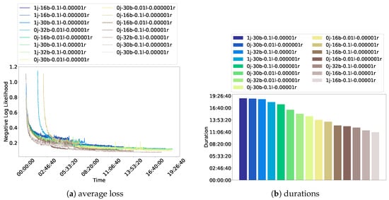 Average loss and duration are the main features we used for measuring progress and are show here. From (a) we can see that the possibility of reaching the 5000 steps without progress limit inasmuch as average loss increases. From the overall durations in (b) we appreciate that the maximum duration is only about 19 and a half hours. The experiments were named according to the following naming convention: <jittering was used>j-<batch size>b-<initial learning rate>l-<minimum learning rate>r.