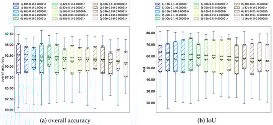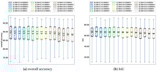 Segmentation satellite results on the World dataset (100 images): (a) is by using dlib’s measure—overall accuracy, (b) shows intersection over union (IoU). The bests model considering the medians (the mean is vulnerable to outliers) are for (a) 1j-30b-0.1l-0.000001r and for (b) 0j-16b-0.1l-0.00001r. The experiments were named according to the following naming convention: <jittering was used>j-<batch size>b-<initial learning rate>l-<minimum learning rate>r.