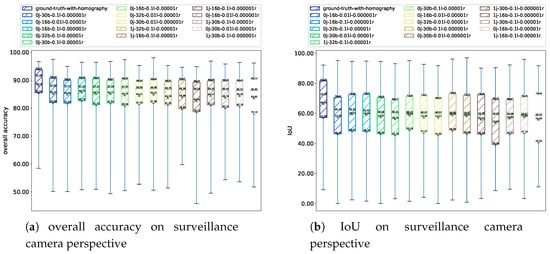 Segmentation camera results on the ITESM dataset (14 + 62 images): (a) is by using dlib’s measure—overall accuracy, (b) shows IoU. The bests model considering the medians (the mean is vulnerable to outliers) are for (a) 0j-30b-0.1l-0.000001r and for (b) 0j-16b-0.01l-0.000001r. Satellite ground truth homography transformation to the camera perspective is provided for reference. The experiments were named according to the following naming convention: <jittering was used>j-<batch size>b-<initial learning rate>l-<minimum learning rate>r.