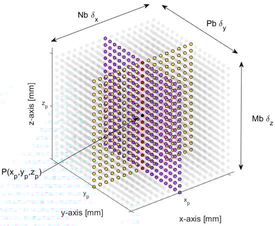 Example of kernel region consisting of MB × NB × PB beamformed samples, distributed according to the step distances δz, δx, and δy for z, x, and y directions, respectively.
