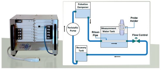 On the left, the ULA-OP 256 scanner with the Vermon probe used for the experiments. On the right, the schematic diagram of the flow phantom.