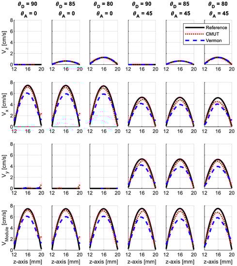 The differences between the profiles produced by the two probes can be appreciated in Figure 5. The velocity components (vx, vy) were better estimated with the CMUT probe, the profiles of which more closely approached the reference. Similarly, the more pronounced underestimation of the lateral velocity components in the Vermon probe yielded a corresponding underestimation of vModule (bottom panels). It is also worth noting that the estimated lateral velocity components (vx and vy, second and third rows) obtained for ϑA = 45° gave similar profiles, confirming their expected symmetry.