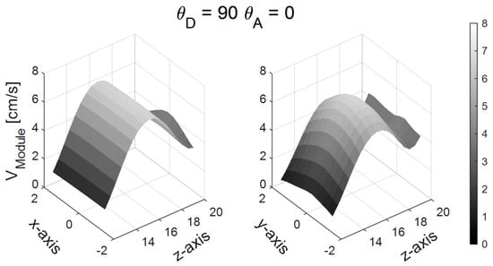Figure 7 shows the velocity profiles experimentally obtained by using the Vermon probe. Qualitatively, the overall trend of the estimated profiles was the same observed from the simulations: vz was estimated with good accuracy, while vz and vy suffered from higher underestimation. The errors reported in Table 3 indicate that, on average, the relative error = 11.5% was lower (roughly 3%) compared with simulations, even if the standard deviation was higher (10.9%). As highlighted by the plots and confirmed in Table 3, when ϑA = 45°, there was no mismatch between the estimates of the vz and vy components. The difference between the bias of the two velocity components was lower than 1%.