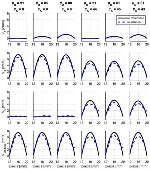 Figure 5 shows the three components and the module of the velocity profiles estimated along the z-axis by using the CMUT and Vermon probes. Six probe-to-flow orientations, distributed by columns, were chosen to test the method when (a) only one velocity component was nonzero (left column), (b) two velocity components were different from zero (columns 2–4), or (c) all three velocity components contributed to the velocity module (columns 5 and 6). In particular, the azimuth angle was set to 45° in the cases shown in the three rightmost columns, which implies that the lateral and elevation velocity components should be identical.