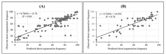 The assessment of predicted and observed data on training and validation sets was used for describing the efficiency of the GRNN model. As can be seen in Table 1, the GRNN model was successful in predicting in vitro shoot regeneration outcomes of wheat in training (R2 > 0.88, RMSE = 14.12, and MBE = −0.33) and validation (R2 > 0.78, RMSE = 14.76, and MBE = −0.89) processes with correlations between observed and predicted data demonstrating a good fit (Figure 3).