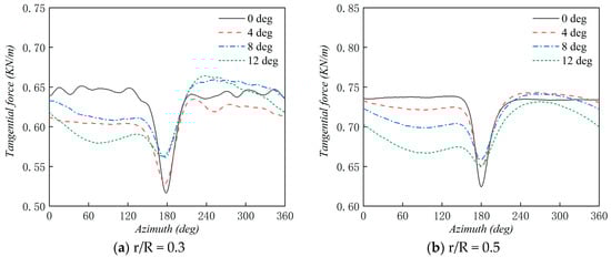Thrust force per unit of span along the rotor span for Blade 1 is shown in Figure 17. In the blade root, the thrust will fluctuate with the change of the azimuth angle, which is mainly caused by the three-dimensional flow of the blade root. In the middle of the blade, when the azimuth angle is 0-180°, the thrust is the largest at 4° tilt angle, and the thrust is the smallest at 12° tilt angle. When the azimuth angle is 180-360°, the thrust gradually decreases as the tilt angle increases. In the vicinity of the blade tip, when the azimuth angle is 0-180°, except for the tilt angle of 0°, the thrust has a change that increases first and then decreases with the change of the azimuth angle. When the azimuth angle is 180-360°, the thrust curve decreases first and then increases, and the thrust gradually decreases as the elevation angle increases. Figure 18 shows the tangential force per unit of span along the rotor span for Blade 1. We can see that in the middle of the blade and near the tip of the blade, the tangential force of the section airfoil in the 180-360° angle range is higher than the value in the 0-180° angle range, except for the case of the 0° tilt angle. At the same time, we found that in the middle of the blade and near the tip of the blade, when the azimuth angle is 180°, the thrust and tangential force at 0° tilt are the smallest, which is mainly due to the maximum interaction between the blade and the tower at 0° tilt angle.