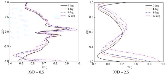 The corresponding vertical x-velocity profiles are presented in Figure 21. When the tilt angle is 0°, as the downstream distance increases, the velocity field behind the wind turbine is approximately symmetrical about the centerline and keeps a circular shape. However, as the tilt angle increases, the velocity field behind the wind turbine shows asymmetry and gradually moves to the upper right. Meanwhile, the low-velocity region at the end of the wake gradually decreases with increasing tilt angle.