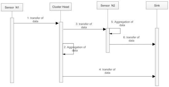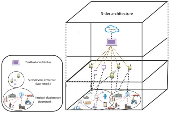 Figure 3 presents our proposed heterogeneous LS-WSN architecture model. The peculiarity of the three-tier architecture that we propose compared to those already existing in the literature [33,34], is that the first two levels of the architecture are built on a set of clusters with a well-defined communication strategy.