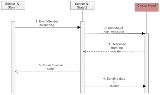 Indeed, considering the low energy autonomy that characterizes sensors in general and those of level 1 in particular, we propose a heuristic based on the management of the radio component of the sensors to reduce the energy consumption. To do so, we opt for an adjustment of the periods of activity and inactivity (sleep) of the sensors. The sensors must obey the principle of event-driven transmission as shown in Figure 4 as well as the interactions between the different levels, the exchange of wake-up messages between “predecessor” and “successor” nodes in the communication chain. In order to respond to alarms that may be triggered, it is intended that nodes (CH), (N2), and (P) remain in listening mode, and upon receipt of wake-up messages, they must perform the programmed tasks without any restrictions.