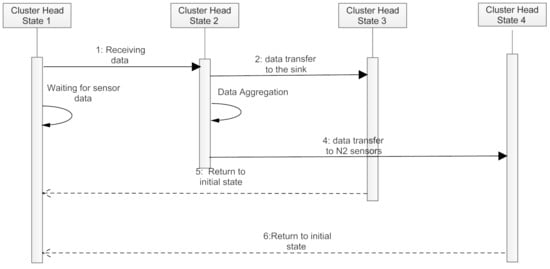 Cluster heads (CHs) are intelligent sensors with more power and energy capacity, responsible for the clusters formed by the level 1 (N1) sensors. They have a data aggregation capacity, which allows them to propose a first level of aggregation of received data. The CHs manage the connection between the level 1 network and the level 2 network. The data received by the CH is analyzed by the latter in order to propose an appropriate routing (level 2 or sink sensors). Four states are used to model the behavior of the CH as shown in the Figure 6.
