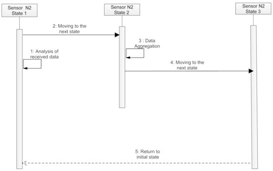 The activity of sensors 2 turns around the multi-stream transfer of data to level 3 (transfer of single data and/or multimedia content). When a message is received from a CH, the level 2 sensor switches to state 2 and checks the detection of movements in its field of vision (recognition by a presence sensor integrated in the Imote2). If data from level 1 is received, the level 2 sensor switches to state 3 and adds its own information (merged with the data received from the CH) and transmits it (e.g., takes a picture) to the sink. If no data is received after a defined delay, it returns to state 1. One of the advantages of the layer 2 network is that the sensors provide auxiliary (safety) routes to reach the sink.