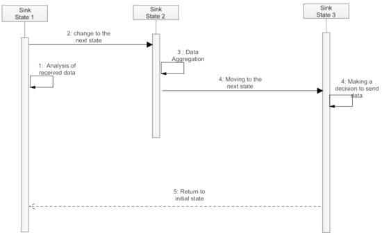 The sink performs a second level of data aggregation (before the data leaves the WSN home automation network). As described in Figure 8. In state 1, the sink is waiting for a wake-up message from its predecessors on the lower levels (Coordinator or Beacon node). When it receives data, state 2 is activated. In this state, it sends the appropriate acknowledgments (msg-ok), and state 3 for alarm management takes place. At this stage, the sink node makes the decision whether or not to send the received data (e.g., alarms) via external communication systems to the monitoring center (hospital, doctors, etc.). Depending on the selection, either state 4 or state 1 takes place. An important detail must be mentioned for level 2 sensors and the sink: the msg-ok expectation is not shown in the state-transition diagram. We assume that acknowledgments for data and wake-up messages are built into the model.