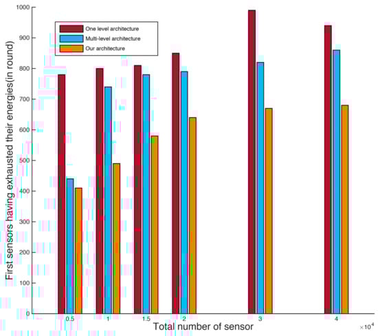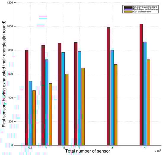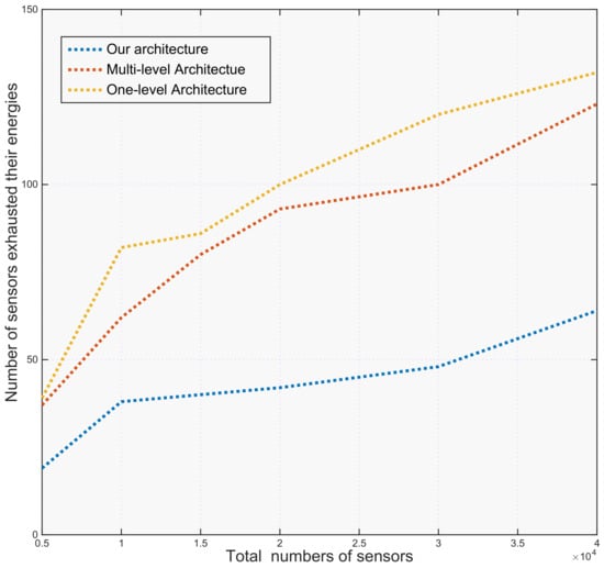 Particularly, Figure 9 and Figure 10 assess the energy consumption of our architecture compared to two other architectures proposed according to two routing protocols namely SEP (Figure 9) and LEACH (Figure 10). The two figures show for each architecture, depending on the number of sensors deployed, when the energy depletion of the sensors occurs. This time is expressed in number of laps.