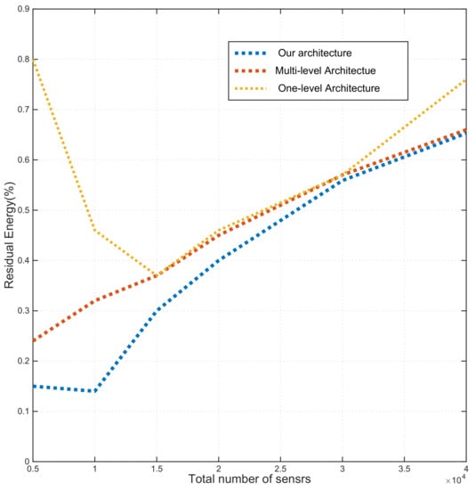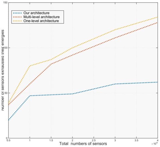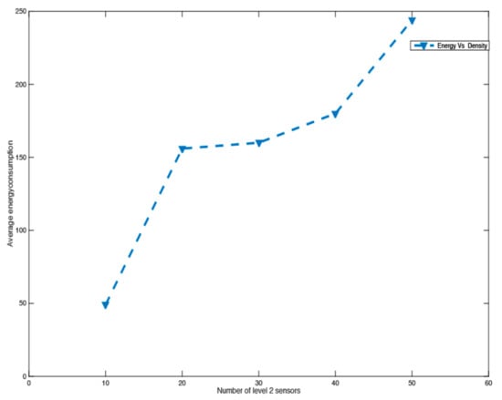 Subsequently, the impact of the network density on the life of the network was studied. Figure 17 shows that the energy consumption of the sensors on the second level of the architecture is dependent on the number of sensors deployed. It is easy to notice through our simulations that the energy consumption of the sensors of this level is proportional to the deployed sensors. These different results show that in addition to the three-tier architecture for LS-WSN deployment, the management of data transmission periods and sensor density contribute well to extending the service life of LS-WSNs.