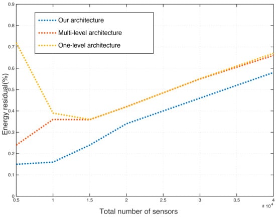 Finally, we evaluated the impact of modeling the tasks of the different sensors across the three levels of the architecture on the energy consumption of the LS-WSN. To do so, we compared our sensor arrangement model with two other models, namely the “Mannasim” model with a single sensor level implemented in the “Homogeneous network” application and the “multi-level” model (MVSN). The different figure highlights the impact of scaling on the average energy consumption of the network. This consumption decreases as the surface area increases (here 15 000 level 2 sensors, transmission interval: 10 s).