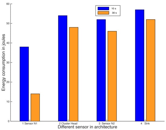 Figure 15 shows the average energy consumption (in Joule) of the sensors of the three levels of the architecture as a function of the transmission time (at a constant step of 10 s). Obviously, energy consumption varies according to the nature and types of sensors. We can clearly see that the well is the type of sensor that is gluttonous for energy: 0.36% of the well’s energy is consumed for a transmission time interval of 10 s (compared to the initial energy of 16200 Joules) and 0.34% for the interval of 30 s. The main reason for this consumption is the well’s operating mode. Due to its nature, the well is the sensor of the model whose radio component must remain in reception mode as long as possible in relation to the sensors (to receive the msg wake-up message). It can also be noted that the consumption of the other sensors (CH), (N1) and (N2) has remained close. The CH consumes 0.33% of its energy for a transmission time interval of 10 s and 0.31% for 30 s, the level 2 sensors consume 0.30% for 10 s and 0.29% for 30 s. Level 1 sensors consume the least amount of energy since 0.24% of energy is consumed for a transmission time interval of 10 s and 0.08% for 30 s. This is due to the fact that level 1 sensors wake up periodically to transfer the collected data to their CH. Confidence intervals in the simulations from Omnet/INET are less than 94.9%.