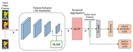 In this part, we accurately describe our network structure and the innovations we propose in the network. In Section 3.1, we explain the role of our proposed NLAM in the frame-level feature extraction process. In Section 3.2, we take one sequence of a video as an example to analyze our proposed NLTP method. In Section 3.3, we explain the loss function we adopted. The structure of the entire network is shown in Figure 2: