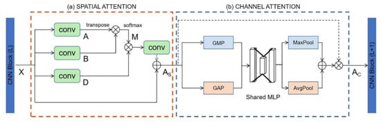 and blocks of CNN. NLAM mainly includes two parts: (a) NLAM spatial attention; (b) NLAM channel attention. represents the feature maps output by the CNN block; expresses the feature maps after NLAM spatial attention; indicates the feature maps after NLAM channel attention as the input of the block. ‘⊕’ denotes the addition operation based on elementwise. ‘⊕’ denotes matrix multiplication. The green box represents convolution. GMP = Global Maximum Pooling, GAP = Global Average Pooling, MLP = Multi-Layer Perceptron.