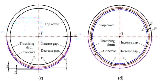 Threshing drum adjustment type and concave adjustment type are shown in Figure 1a,b, respectively, and the resulted threshing gap cross sections are shown in Figure 1c,d, respectively. The initial gap between the threshing drum and the concave grid is 20 mm. For concave adjustment type, moving the concave grid upwards and downwards to increase the threshing gap to 30 mm or decrease it to 10 mm can only result in the change of the threshing gap between the bottom of the concave grid and the drum. However, the threshing gaps on both sides of the concave grid and that between the top cover and the drum will not change. As the result, the adjustment of threshing gap within the thresher device is not complete and the threshing gap is not even. In the case that the feed rate is too large, it is very difficult to ensure that no blockage will occur in the thresher device by increasing the threshing gap at the bottom of the concave grid only. In the case that the threshing gap has to be reduced due to the changes of the operation performance specifications of the threshing device, such as entrainment loss rate and the damage rate, it is very difficult to ensure the operation performance of the threshing device completely by decreasing the threshing gap at the bottom of the concave grid only. With the threshing drum adjustment type, in the case of increasing the threshing gap to 30 mm or decreasing it to 10 mm by changing the drum diameter, the threshing gap within the thresher device will change at the same time and the threshing gap is even. Therefore, when the feed rate is too large, increasing the threshing gap evenly may effectively prevent the thresher device from being blocked, while decreasing the threshing gap evenly may effectively ensure the operation performance of the thresher device as well.