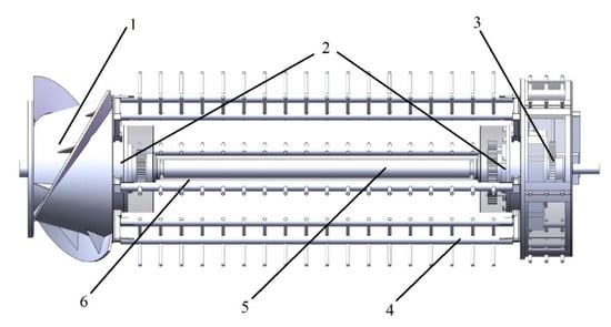 3D diagram of variable-diameter threshing drum, 1. Feed wheel, 2. Diameter adjustment device, 3. Electronic control self-locking device, 4. Threshing rack, 5. Drum main shaft, 6. Sleeve.