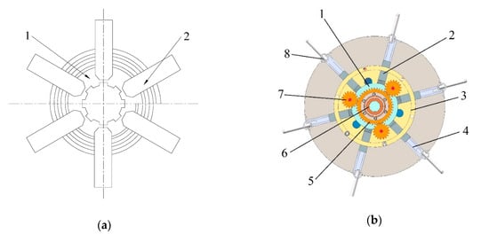 Structure diagram of device for diameter adjustment, 1. Constant speed spiral disc, 2. Claw, 3. Limit disc, 4. Connecting rod, 5. Sun wheel, 6. Spline sleeve, 7. Planet wheel, 8. Threshing tooth rod: (a) Constant speed spiral disc and claws; (b) device for diameter adjustment.
