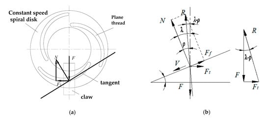 The plane threads on the constant speed spiral disc are simplified to single-tooth plane threads for force analysis. The claw is taken as the research object. As shown in Figure 4a, it is assumed that the centrifugal force F acting on the claw is concentrated on the meshing points on the spiral, the counter force N is perpendicular to the tangent of the meshing points, and the inclination angle of the tangent line λ is the helix one. For further force analysis of meshing point, as shown in Figure 4b, when the claw moves downwards under centrifugal force, the friction Ff goes upwards. In the figure, R is the resultant force of normal reaction N and friction force Ff, Ft is the horizontal force component of R, friction angle ρ is the angle between R and N, and the angle between R and centrifugal force F is .