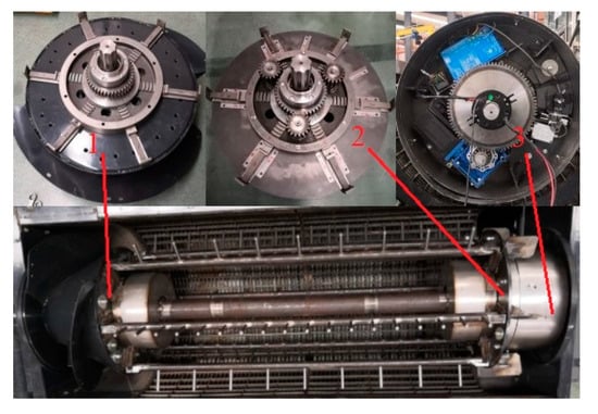 The variable-diameter drum consists of three parts: feeding section, threshing and separation section, as well as electronic control self-locking section. One group of diameter adjustment devices were installed on the supporting wheel behind the feeding wheel and the other group of diameter adjustment devices were installed on the rear supporting wheel, as shown in Figure 7. The electric conduction link (MOFLON, Shenzhen, China) was installed at the end of the drum shaft, which was used to transfer current for the motor and transmit the signal generated by the displacement sensor to the processor outside the thresher device. The feeding wheel and the electronic control self-locking part were installed on both ends of the threshing and separation section, thus to form the complete variable-diameter drum in which the feeding wheel was connected with the electronic control self-locking device through the main shaft and six threshing rack. In addition, a pair of diameter adjustment devices were connected through the sleeve. Static balance test and dynamic balance test as well as counterbalance should be applied to the assembled variable-diameter drum, thus to ensure the dynamic balance stability of the variable-diameter drum.