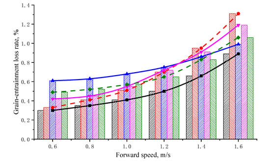 The forward speed of 0.6–0.8 m/s was defined as low speed and the corresponding feed rate was relatively low; the forward speed of 1–1.2 m/s was defined as medium speed and the corresponding feed rate was normal; the forward speed of 1.4–1.6 m/s was defined as high speed and the corresponding feed rate was large [26]. It can be seen from the bar graph that the grain-entrainment loss rates under all the five different threshing gaps increased with the rising of the forward speed. Under low speed, the entrainment loss rates listed in ascending order are: initial gap of 20 mm, threshing drum adjustment type of 10 mm, concave adjustment type of 10 mm, threshing drum adjustment type of 30 mm, and concave adjustment type of 30 mm. Under medium speed, with the increase of forward speed, the entrainment loss rate with concave adjustment type of 30 mm remained the highest. The entrainment loss rate with threshing drum adjustment type with 10 mm and that with concave adjustment type of 10 mm exceeded the entrainment loss rate with threshing drum adjustment type of 30 mm. The entrainment loss rate with initial gap of 20 mm remained the lowest. Under high speed, the entrainment loss rate with threshing drum adjustment type of 10 mm was the highest, while the entrainment loss rate with concave adjustment type of 10 mm was in the second place. The entrainment loss rate with threshing drum adjustment type of 30 mm exceeds that with concave adjustment type of 30 mm and took the third place. The entrainment loss rate with initial gap of 20 mm was the lowest. The entrainment loss rate decreased at first and then increased with the increase of the threshing gap. This is because that with the increase of the threshing gap, the thickness of grain layer is thinned, and grain has increased possibilities to penetrate the grain layer. Therefore, the entrainment loss rate is becoming smaller gradually; while when the threshing gap is too large, the condition goes against the separation of grains, therefore the entrainment loss rate will go higher.