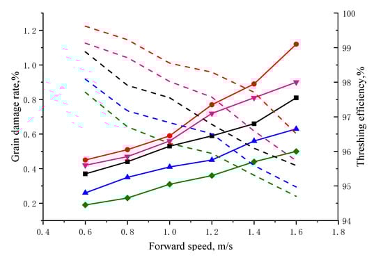 It can be seen from Figure 9 that with five different threshing gaps, with the increase of forward speed and feed rate, the grain damage rate would increase gradually. The damage rate with concave adjustment type of 30 mm was the lowest and that with concave adjustment type of 30 mm took second place. Besides, the rising trends in both cases are relatively stable. The damage rate with initial gap of 20 mm was on the medium level, and that with threshing drum adjustment type of 10 mm was the highest, which was higher than the damage rate with concave adjustment type of 10 mm. Too small a threshing gap may result in the sharp increase of damage rate in both cases when the forward speed is within the range of 1.2–1.4 m/s. With the increase of forward speed, the threshing efficiency would decrease gradually. The threshing efficiency with threshing drum adjustment type of 30 mm was the lowest and that with concave adjustment type of 30 mm took second place. Besides, the decreasing trends in both cases were relatively stable. The threshing efficiency with an initial gap of 20 mm was on the medium level, and that with threshing drum adjustment type of 10 mm was the highest. The threshing efficiency with concave adjustment type of 10 mm took second place. Small threshing gap may result in the sharp decrease of threshing efficiency in both cases when the forward speed is within the range of 1.2–1.4 m/s. It can be seen from the curve growth trend of Figure 8 and Figure 9 that when the speed is between 0.8-1.0m/s, the increase in entrainment loss rate and damage rate are lower, the threshing efficiency is higher, and the harvest efficiency is the best at this time.