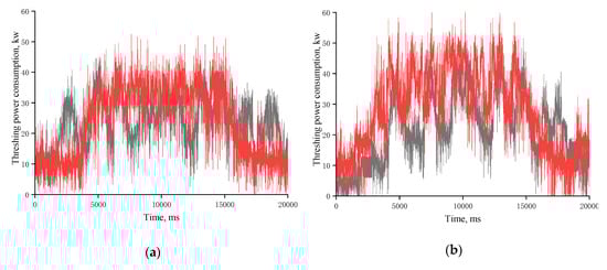 Diagram for the comparison in terms of threshing power consumption between both adjustment methods at the forward speed of 1 m/s, the red line is threshing drum adjustment type, the black line is concave adjustment type: (a) Threshing drum adjustment type and concave adjustment type with the threshing gap of 30 mm; (b) Threshing drum adjustment type and concave adjustment type with the threshing gap of 10 mm.