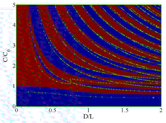In Figure 1, the alternating positive and negative boundaries (except for green) are the phase velocity curves of each order of the elastic longitudinal wave described by P-C frequency equation. Under the specific Poisson’s ratio, the real part symbol of the function and the distribution diagram of discontinuous points are drawn, and then several typical values corresponding to each order’s curve are selected from the graph. Finally, the phase velocity curve of each order is obtained by solving the numerical equation by iterative method.