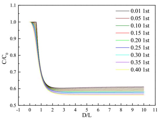 Figure 2 shows the first-order phase velocity curves under different Poisson’s ratios. It can be seen from the figure that the phase velocity of low-frequency stress wave is close to . As the frequency increases, the wavelength becomes shorter. The phase velocity first decreases to the lowest value and then increases slowly to approach the asymptotic value (Rayleigh surface wave velocity). When Poisson’s ratio is 0.01, the phase velocity of stress wave propagation is almost constant in the low frequency range of , . When Poisson’s ratio is 0.05, this range becomes , and when Poisson’s ratio is 0.4, it is further reduced to . Therefore, a smaller Poisson’s ratio is beneficial to maintain the same propagation velocity in a wide frequency range and reduce the dispersion effect.