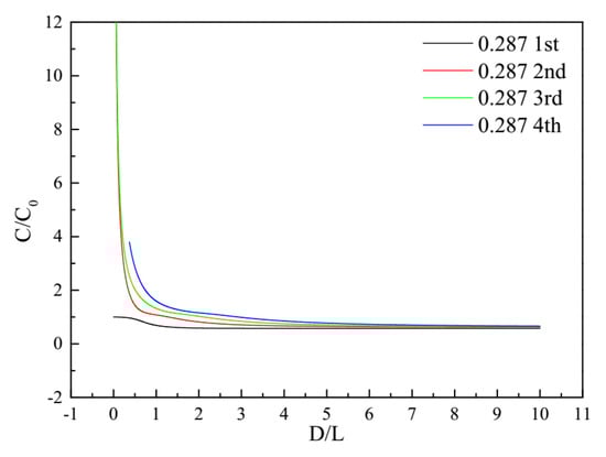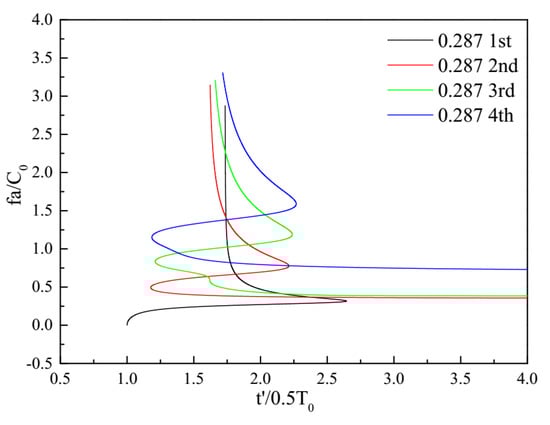 Both of the normalized frequency parameters described by Equation (6) and the normalized propagation time parameters described by Equation (7) can be obtained by simple calculation of the phase velocity curve (Figure 3) and group velocity curve (Figure 4) and their independent variable . Figure 5 is the first to fourth orders of normalized frequency and propagation time curve when Poisson’s ratio is 0.287. Assuming that there are no dispersion effects of various orders in the bar, a vertical line should be shown in Figure 5 and the abscissa should be 1, that is, each frequency component in the bar propagates at the same velocity and reaches any point in the pressure bar at the same time. However, considering the dispersion effect, each order curve is not a simple vertical line, but presents a more complicated pattern.