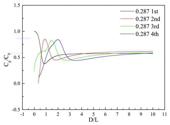 According to formula (3), the group velocity curve can be calculated from the phase velocity curve shown in Figure 3. It can be seen from Figure 4 that the group velocity curve is non monotonic, and the stress waves of different wavelengths may have the same group velocity. The first-order group velocity curve shows a character of decrease followed by slow increase, which can be summarized as low-frequency fast, medium-frequency slow, and high-frequency approximating constant velocity. In the case of low frequency, , that is, the wave packet propagation velocity is consistent with the elementary theoretical wave velocity. When the intermediate frequency part is , the group velocity decreases to the minimum value of . With further decrease of wavelength, the group velocity gradually converges to .