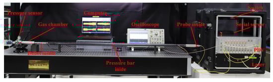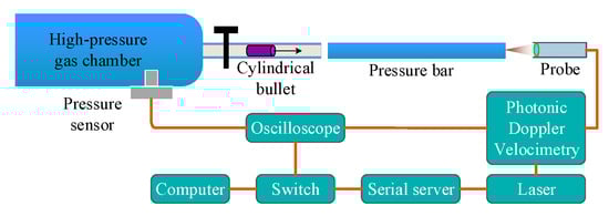 A testing system was set up for experimental verification after the installation of eight sets of pressure bar sensors, as shown in Figure 6. The testing system consisted of a high-pressure chamber, gas pressure sensors, cylindrical bullet, a laser, a PDV, a serial server, a switch, an oscilloscope, and a computer. The testing process can be described as follows: