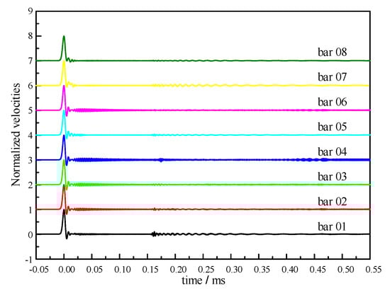 Figure 9 summarizes the waveforms within the first peak intervals of the eight bars obtained from the testing experiments without containing the subsequent reflected signals. The curves’ baselines are shifted, and the peaks are normalized and then aligned to time zero. It can be seen that the first peaks are followed by high-frequency oscillations, amongst which the large amplitude appears at about 0.16 ms.