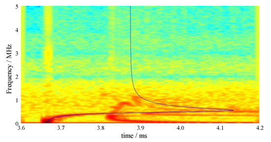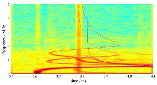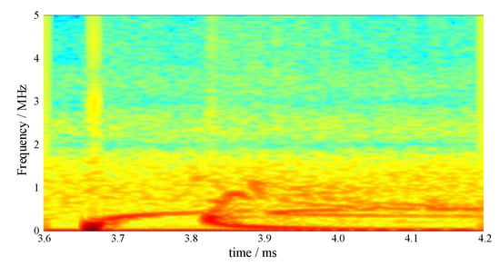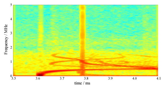 The abscissa and ordinate in Figure 5 are converted into time and frequency by Equations (20) and (21), then the time-frequency joint spectrum is obtained after a 3.666 ms-shift on the time axis as shown in Figure 11. It can be seen that the time-frequency components in the measured signal are in agreement with the first-order propagation mode given by theory, but with a lower frequency upper limit (less than 1 MHz). In addition, the frequency components between 3.8 ms and 3.9 ms are different from the longitudinal stress wave given by the theory, which is determined as a bending wave and will not be discussed in this paper. The results demonstrated that the axial velocity of the center of the pressure bar 01 is dispersed according to the first-order propagation mode.