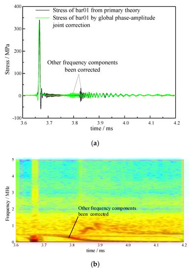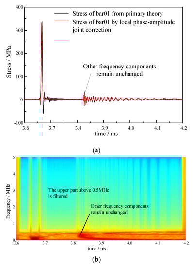 The local phase-amplitude joint correction method proposed in this paper was then used to correct the velocity signal to obtain the average stress signal of the compression surface of the pressure bar. The upper frequency limit was set to 0.5 MHz, signals beyond this frequency limit were considered to be noise and were filtered out. Signals in the frequency band were not phase-corrected, except for the first-order propagation mode. As can be seen from Figure 15, the diffuse signal between 3.67 ms and 3.82 ms is well corrected, while impacts on oscillations around 3.83ms are minimal, therefore, the additional errors that were introduced can be neglected.