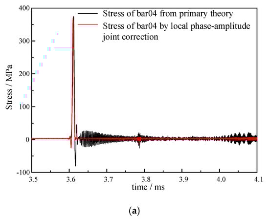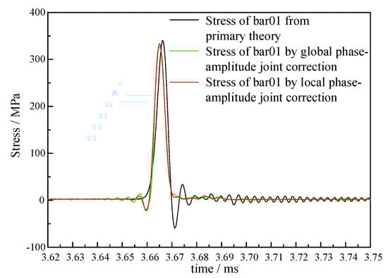 For comparative analysis, the velocity signal of the pressure bar 01 was first corrected for dispersion using the global phase-amplitude joint correction method in the first-order propagation mode. The global phase-amplitude joint correction method corrected the phase and amplitude of frequency components over the full duration of signal. The corrected result is shown in Figure 14. For comparison, the time was selected to be aligned with the original signal, and the upper limit of the phase correction frequency was set to be 0.5 MHz. In Figure 14a, the black line is the stress curve obtained by multiplying the velocity by the conversion coefficient given by the elementary theory (Table 3), and the green line is the stress curve obtained by the global phase-amplitude joint correction. It is noteworthy that the oscillation around 3.83 ms is moved forward, and this part of the oscillation is not the frequency characteristic described by the first-order propagation mode of the axial stress wave, indicating that the global phase-amplitude joint correction method will introduce new errors.