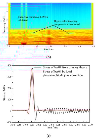 The local phase-amplitude joint correction method was further used to process the signal of the bar 04. The frequency range of each order propagation mode was set by parameters in Table 4. Figure 17a compares the corrected curve and the curve given by the elementary theory. It can be seen that the amplitude of the oscillation following the main peak is greatly reduced, while the frequency component of the non-axial stress wave around 3.785 ms is minimally influenced. Figure 17b shows the time-frequency joint time spectrum of the corrected stress signal. Components higher than 1.8 MHz were filtered out, while the first-order propagation mode still has components with lower amplitude. Further improvement of the algorithm is needed. The second and third-order propagation modes are well corrected, and the local positions marked in the figure appear as light blue with lower energy. Figure 17c is the local magnification of the bar-end average stress curve and the stress curve given by the elementary theory near the main peak. The rising edge of the stress signal given by the elementary theory is 4.09 μs, and the rising edge after local correction is 2.70 μs (10%~90%). Similar to results of the pressure bar 01, the negative peak oscillations of the main peak in the pressure bar 04 are present.