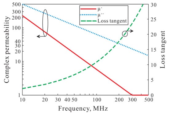 The complex permeability and magnetic loss tangent properties of the ferrite (SN-20, Samwha Electronics [18]) are shown in Figure 2. Here, and are respectively real and imaginary parts of the complex permeability, and the magnetic loss tangent of the ferrite is calculated by . The permittivity value of the ferrite is 12 in the operating frequency band (from 30 MHz to 300 MHz). SN-20 with a high in the HF/VHF band is very useful to improve the gain of a loop type ESA. However, the value of gradually decreases to 1 as the frequency is increased. The magnetic loss tangent of the ferrite increases sharply as the frequency is increased because the decreasing rate of is higher than that of .