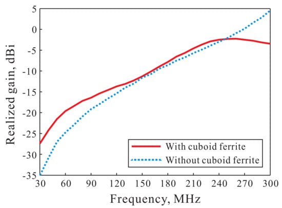 Figure 3 plots the simulated realized peak gains of the Spidron fractal loop antenna with and without cuboid ferrite. The gains of the antenna with and without ferrite range from −27.4 to −2.2 dBi and from −35.1 to 4.5 dBi, respectively, in the operating band. When the ferrite is loaded into the antenna, the radiation Q of the antenna is reduced due to the high of SN-20. As the result, the gain of the Spidron fractal loop antenna with the ferrite is considerably improved than that without the ferrite in the low frequency band. On the other hand, a gain reduction was noted in the high frequency band due to the high magnetic loss tangent of the ferrite.