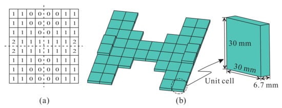Ferrite configuration: (a) Optimized 8 × 8 grid cells; (b) Optimized ferrite configuration and unit cell.
