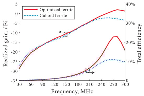 Figure 5 shows the simulated realized peak gains and the efficiency rates of the Spidron fractal loop antenna with the optimized and cuboid ferrite on the 10 m × 10 m ground plane. The configuration of the cuboid ferrite is depicted in Figure 1b. The amount of the ferrite is decreased to 37.5% relative to the cuboid ferrite after the optimization process. The low frequency gain of the antenna with the optimized ferrite is slightly lower than that of the cuboid ferrite due to the reduced amount of ferrite. However, the gain improvement is similar to that in the results of the cuboid ferrite. In the high frequency band, the total efficiency of the antenna with the optimized ferrite is higher than that of cuboid ferrite due to the reduced magnetic loss of the ferrite. Therefore, the high frequency gain of the antenna with the optimized ferrite is improved considerably relative to that of the cuboid ferrite. The gain of the loop antenna with the optimized ferrite ranges from −28.9 to 2 dBi in the operating band.
