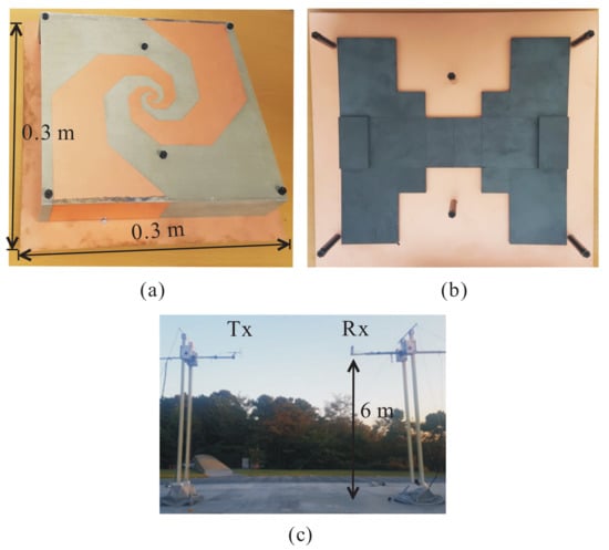 Figure 6a presents a photograph of the proposed antenna. To simplify the fabrication and measurement steps, the size of the ground plane is reduced. The ground plane of the fabricated proposed antenna has a square structure with a length of 0.3 m. Figure 6b shows a top view of the fabricated ferrite structure. The configuration for the optimized ferrite has it is attached onto the center of the ground plane. Six nylon posts with a relative dielectric constant of 3.2 are used to support the substrate with an etched Spidron fractal structure. The antenna measurement circumstance is illustrated in Figure 6c. The gain was measured in an electromagnetic wave open area test site 60 m × 30 m in size at the Korea Research Institute of Standards and Science. The transmission and receiving antenna (proposed antenna) is positioned 6 m above the ground.
