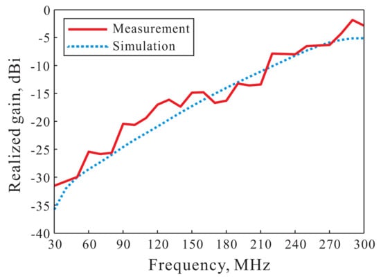 Figure 7 presents the simulated and measured realized peak gains of the proposed antenna on the -plane. The realized peak gains are the total radiated power of the linear polarization. The simulated and measured gains range from −35.8 to −5.1 dBi and from −31.6 to −1.9 dBi, respectively. This graph indicates that the simulated and measured results are in good agreement in the operating frequency band. The slight difference between the simulated and measured results arose due to calibration differences and reflected and scattered waves from the ground.