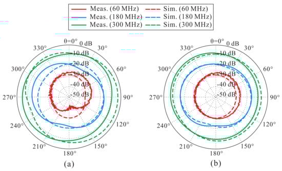 Simulated and measured radiation patterns at 60, 180, 300 MHz on two planes (-plane and -plane) are shown in Figure 8. The simulated and measured results are indicated by the dashed and solid lines, respectively. The radiation patterns of the proposed antenna are omni-directional at all frequencies. The feeding location is tilted toward the -axis relative to the center of the antenna, resulting in some asymmetry patterns. The differences between the simulated and measured results arose due to the weather at the measurement center, manufacturing uncertainties, and similar causes.